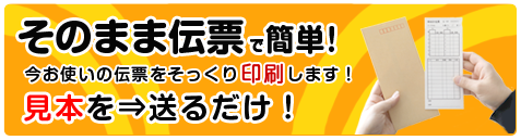 お客様が現在お使いの伝票を見本としてそのまま伝票印刷(そっくり伝票印刷)を行います!①郵送で既存の伝票をお送り いただく②スマホやデジカメで伝票の写真データを送信する。これだけですぐに伝票印刷費のお見積りを致します!